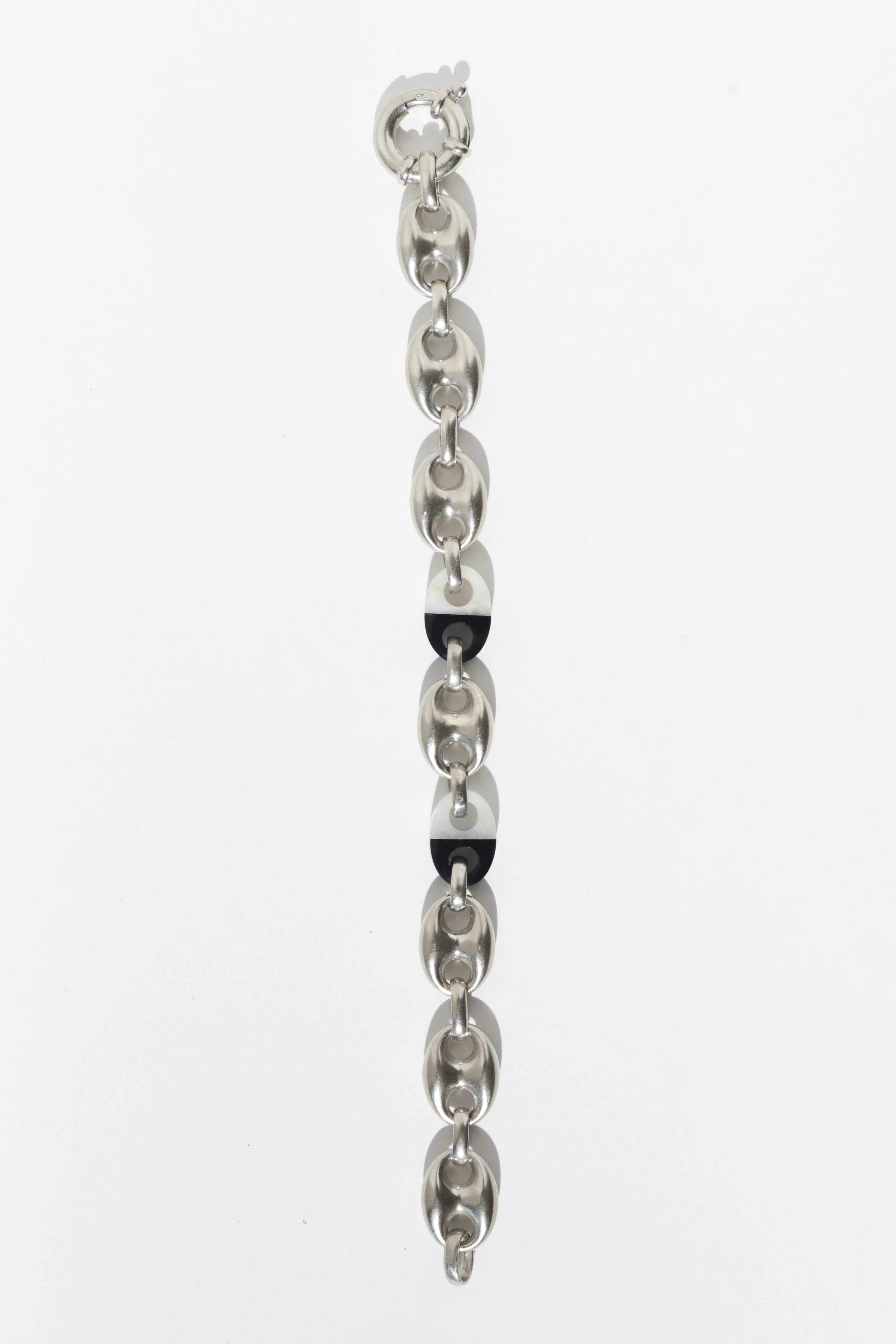 Introducing our Mooi Bracelet, a handmade puffed mariner link paired with two black onyx and white moonstone beads finished with a circular bolt clasp. Designed for versatility and durability, this bold yet minimal bracelet makes the perfect statement for everyday wear. Each mariner link has been carefully perfected to give dimension and depth, ensuring the design feels substantial rather than flat.
