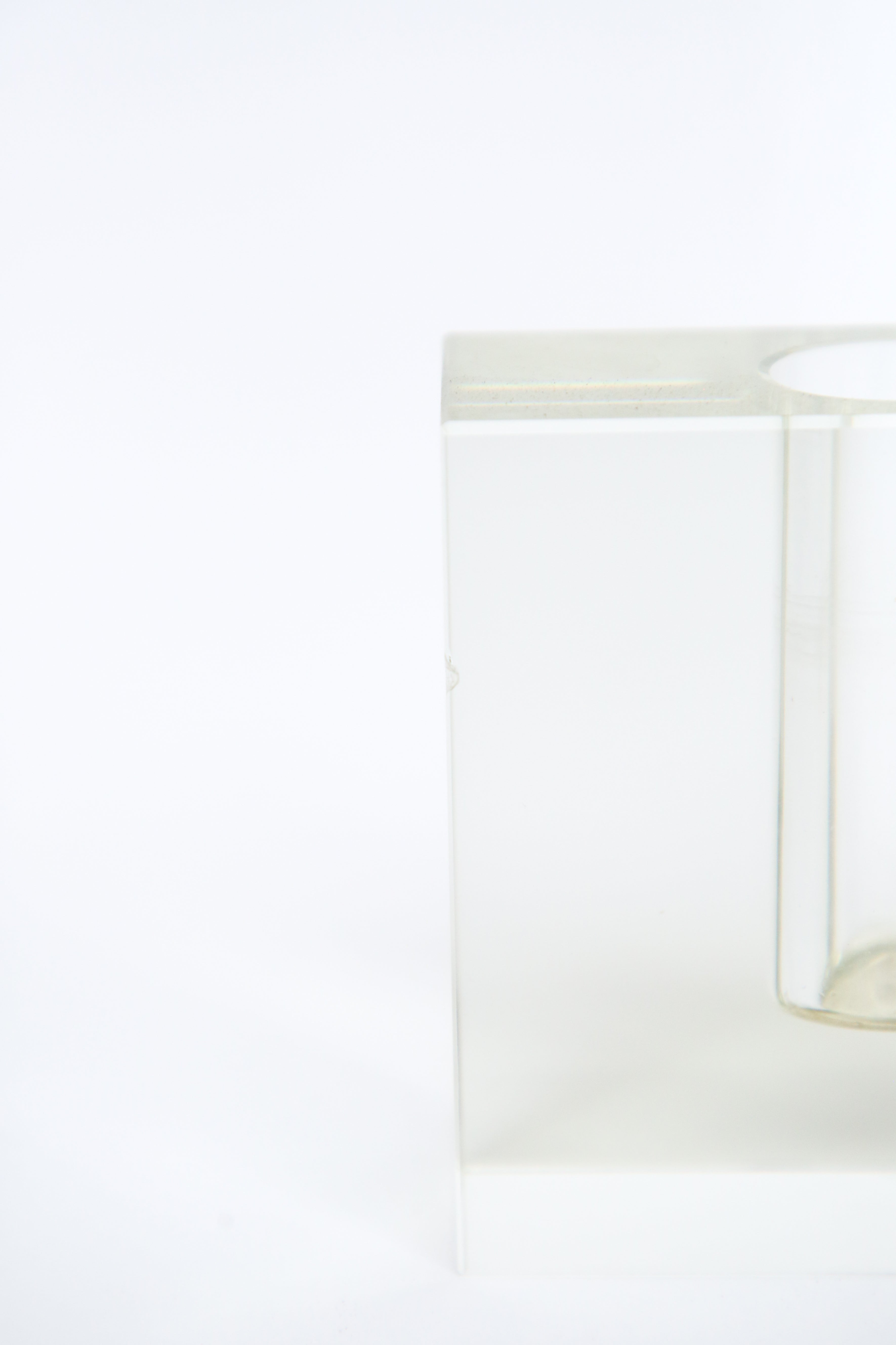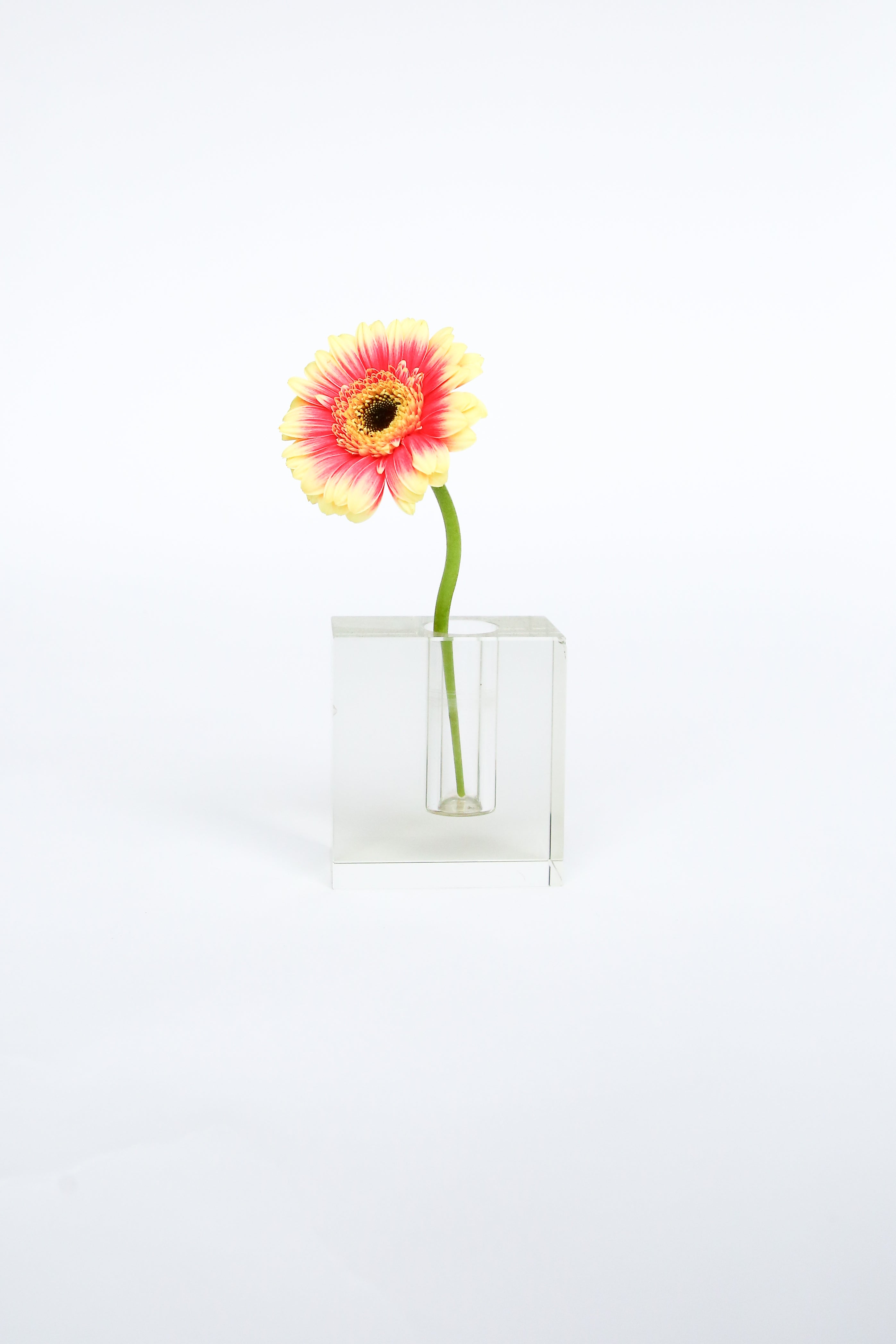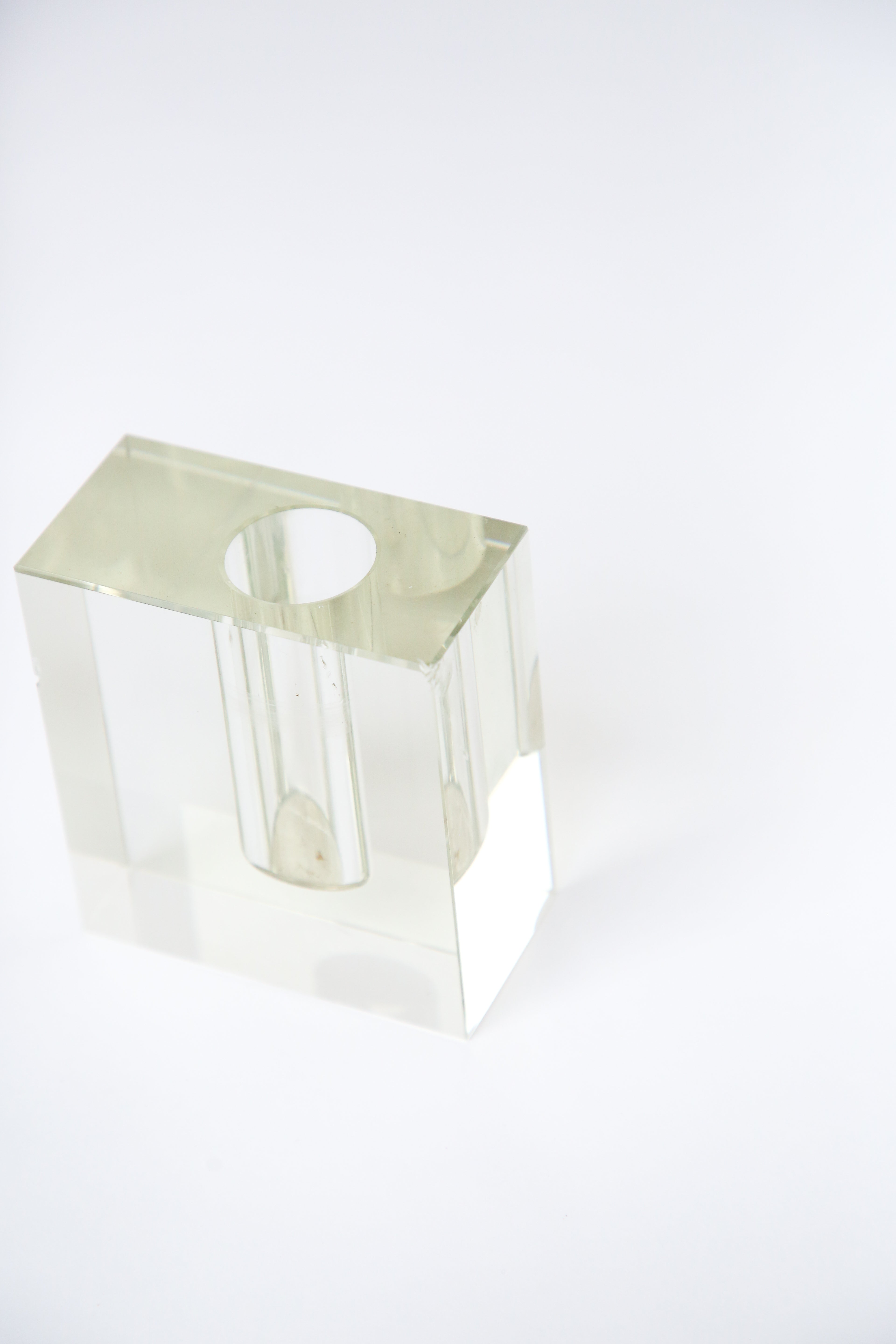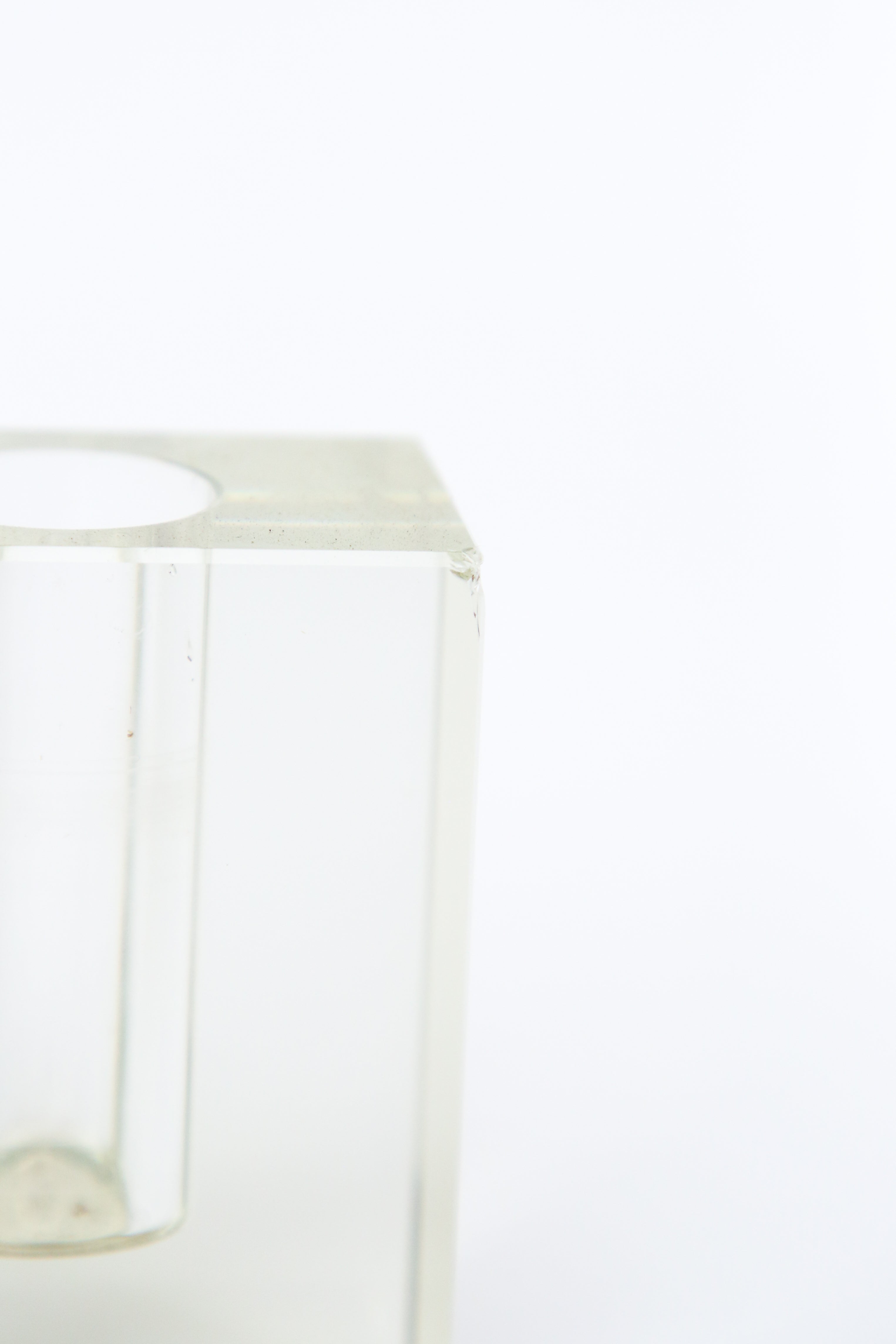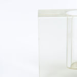 Vintage Crystal Square Vase features a sleek, modern square shape perfect for holding a single stem. Multiple small dings throughout add character and vintage charm, making each piece truly one-of-a-kind. Ideal as a minimal accent or to showcase a favorite bloom.