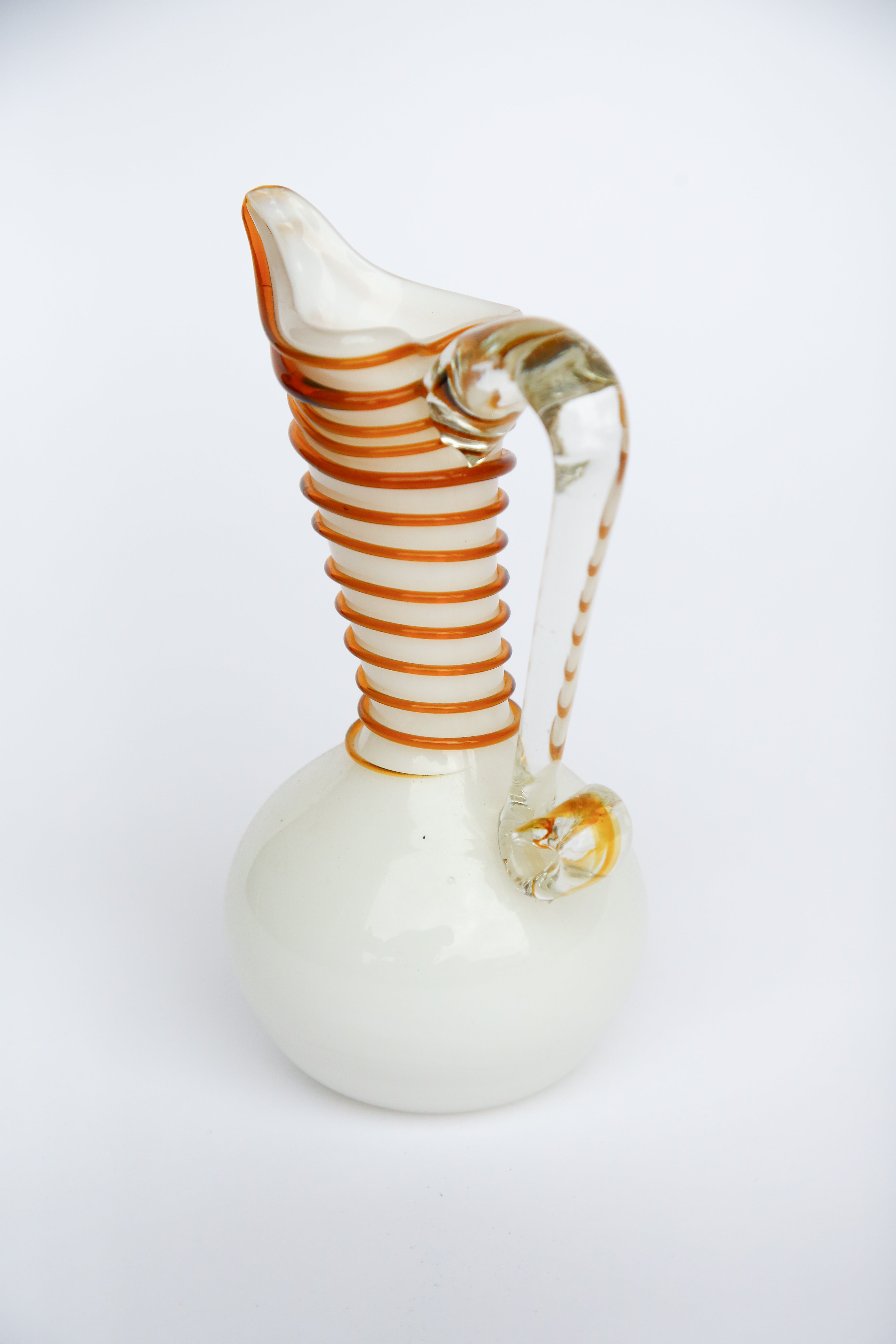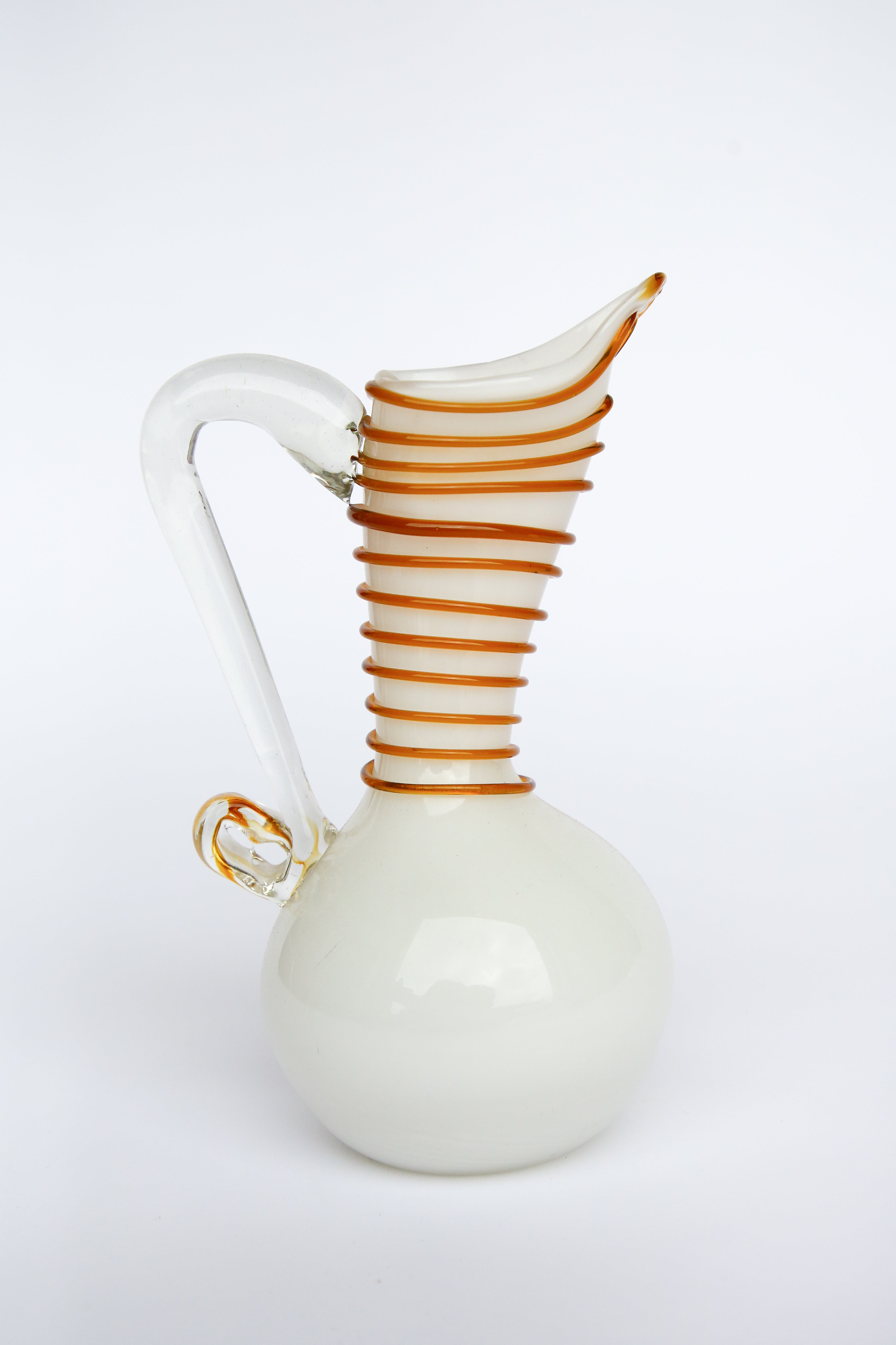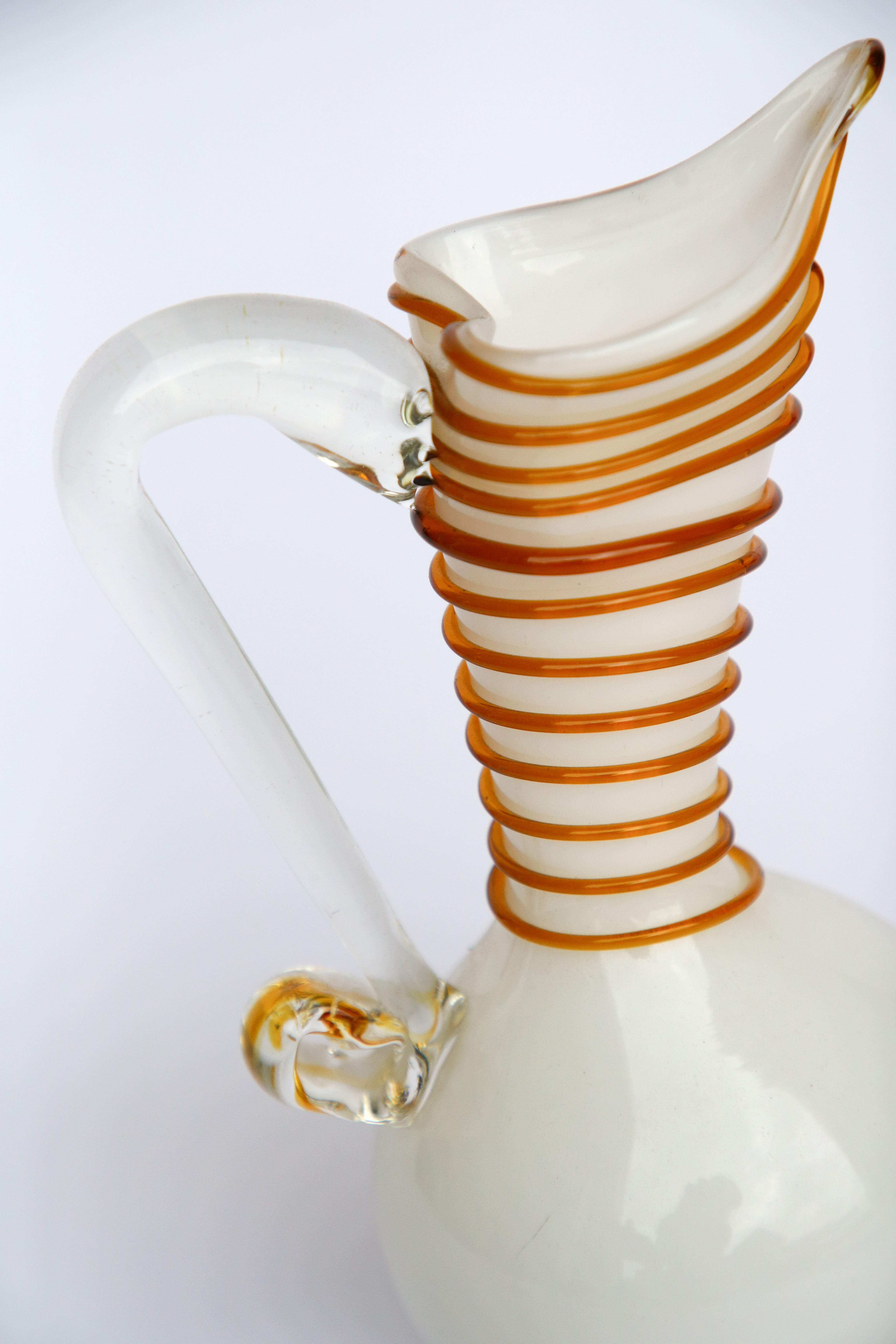 Vintage Italian Handblown Pitcher Vase features a swirling white and amber wrapped design.