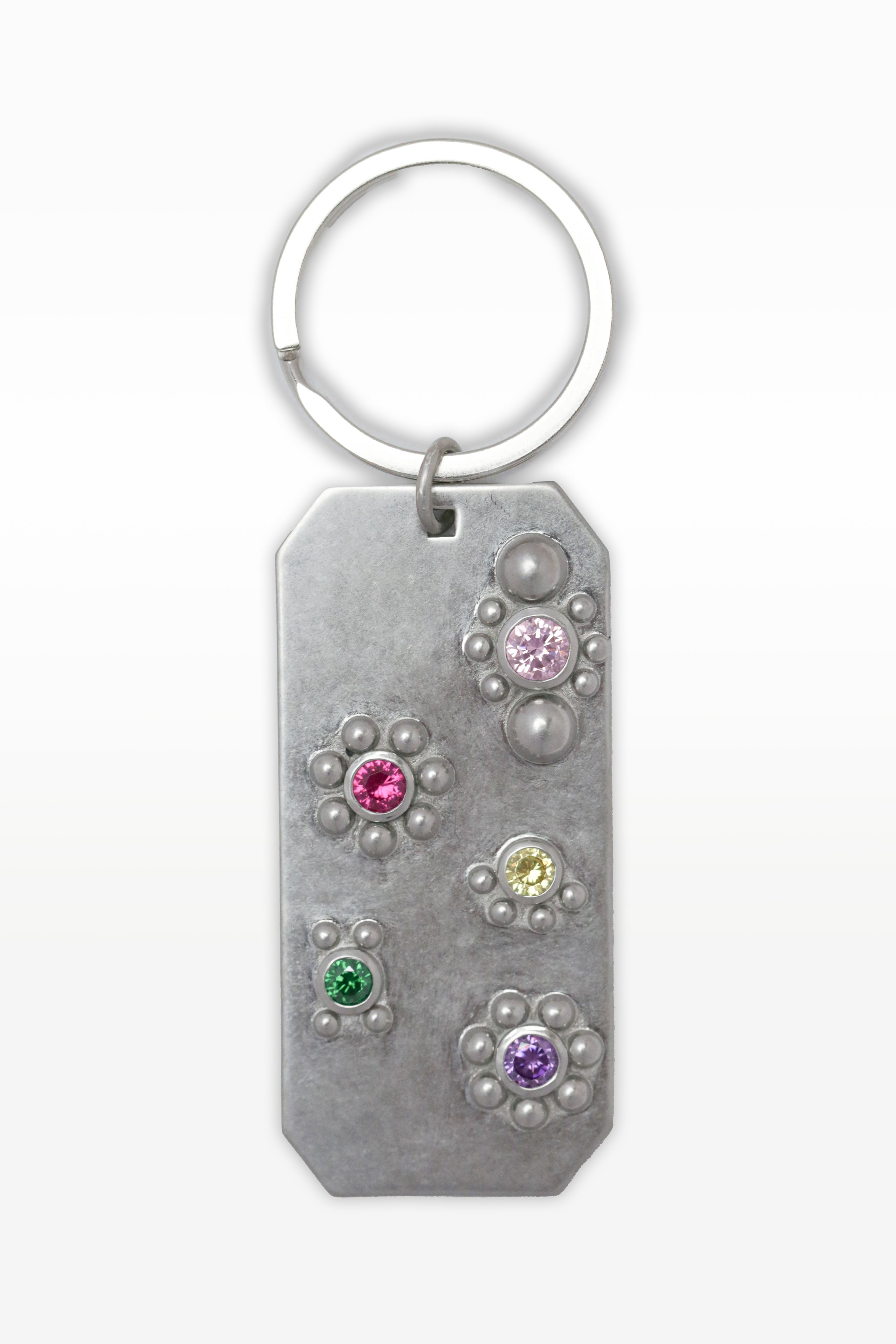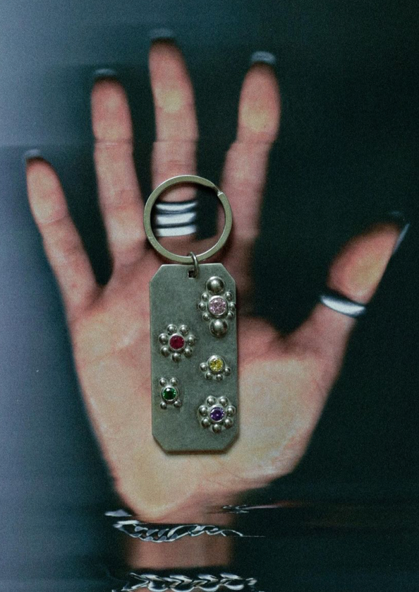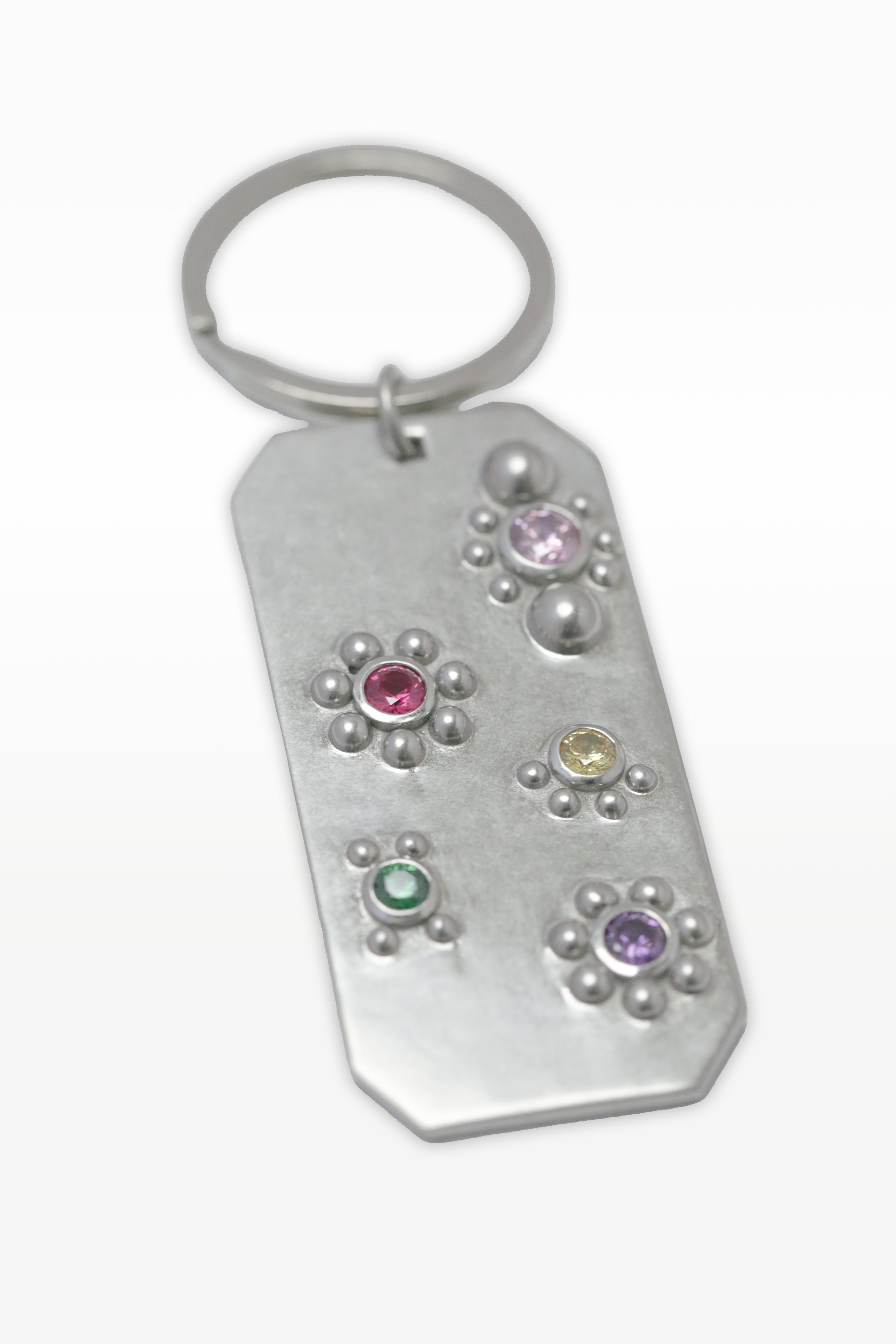 This keychain features five vibrant gemstones linked to a sturdy keychain ring, creating a colorful and eye-catching accessory. Handmade with care, it combines practicality with bold style, making it perfect for everyday use or as a thoughtful gift.