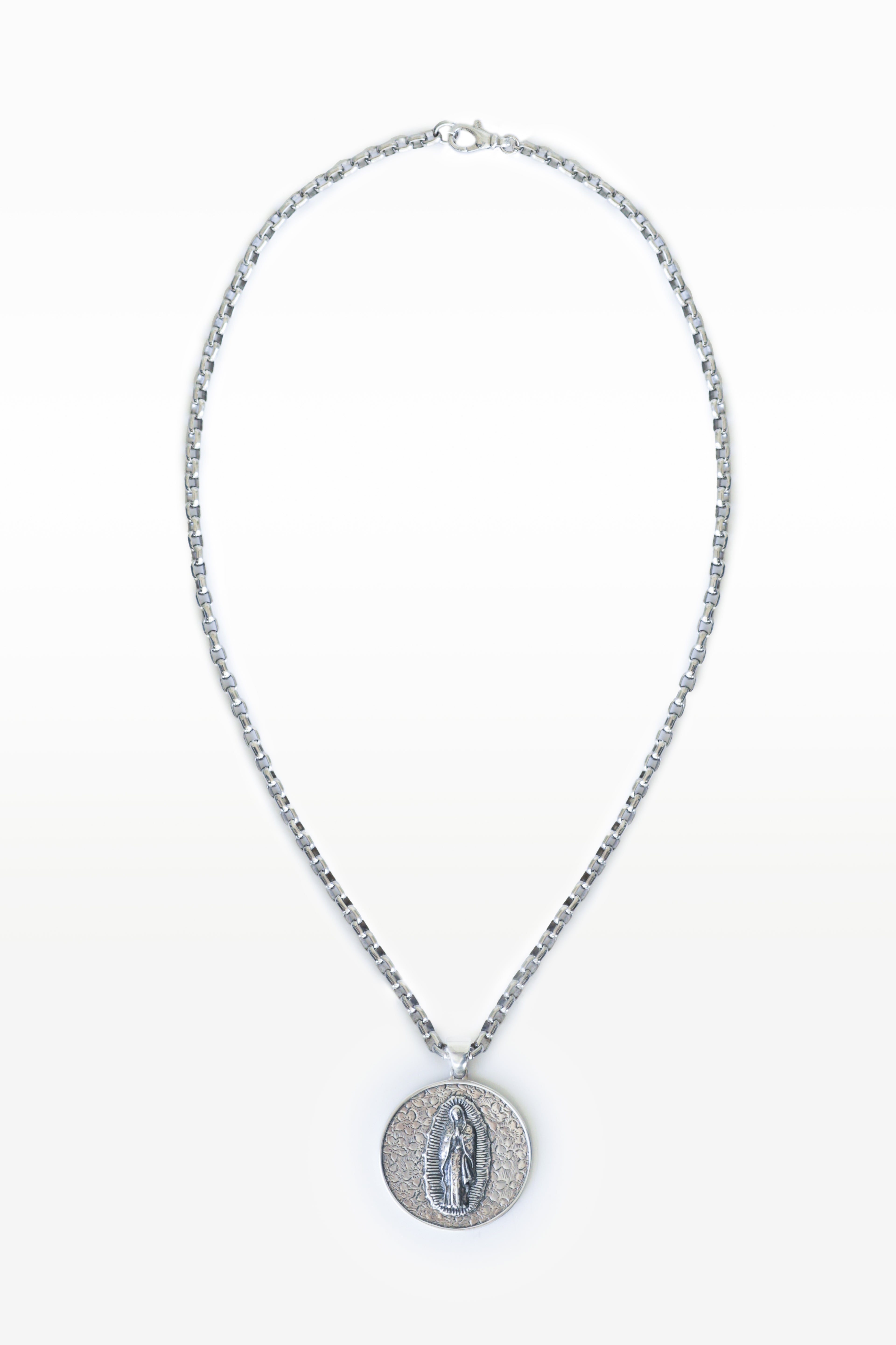 An 18-inch sterling silver box chain necklace featuring a Virgin Mary pendant with delicate floral etching. Thoughtfully crafted to highlight fine detail, this piece carries both elegance and symbolism. Its timeless design makes it perfect for layering or wearing on its own as a meaningful everyday piece.