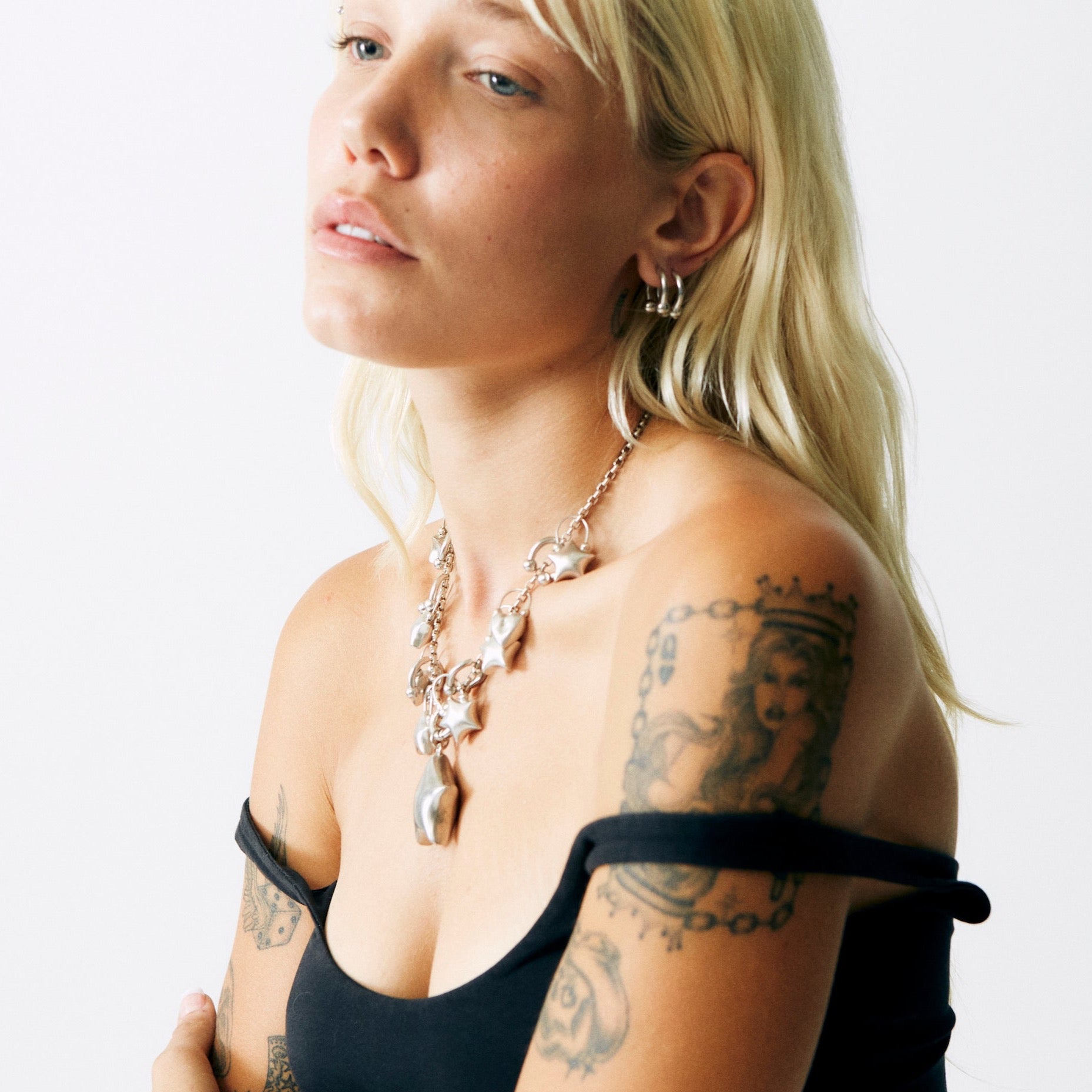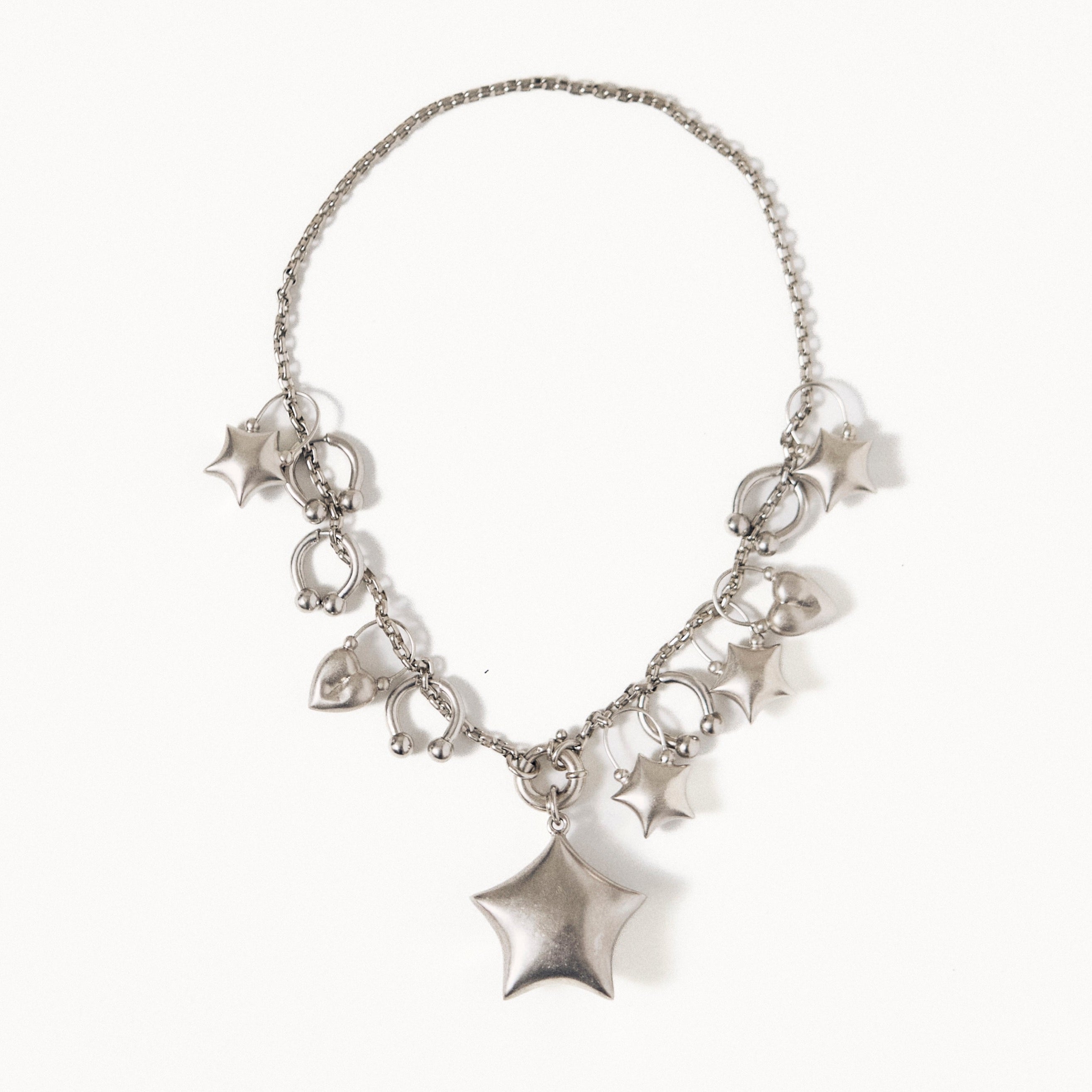 The Charm Necklace, hand-designed and created by us, is a versatile statement piece that transforms into multiple styles. This sterling silver design includes four puffed star earrings, two puffed heart earrings, five barbell earrings, and the 18inch puffed star necklace. Wear it as a bold charm necklace or style the pieces individually as earrings, giving you endless ways to accessorize.