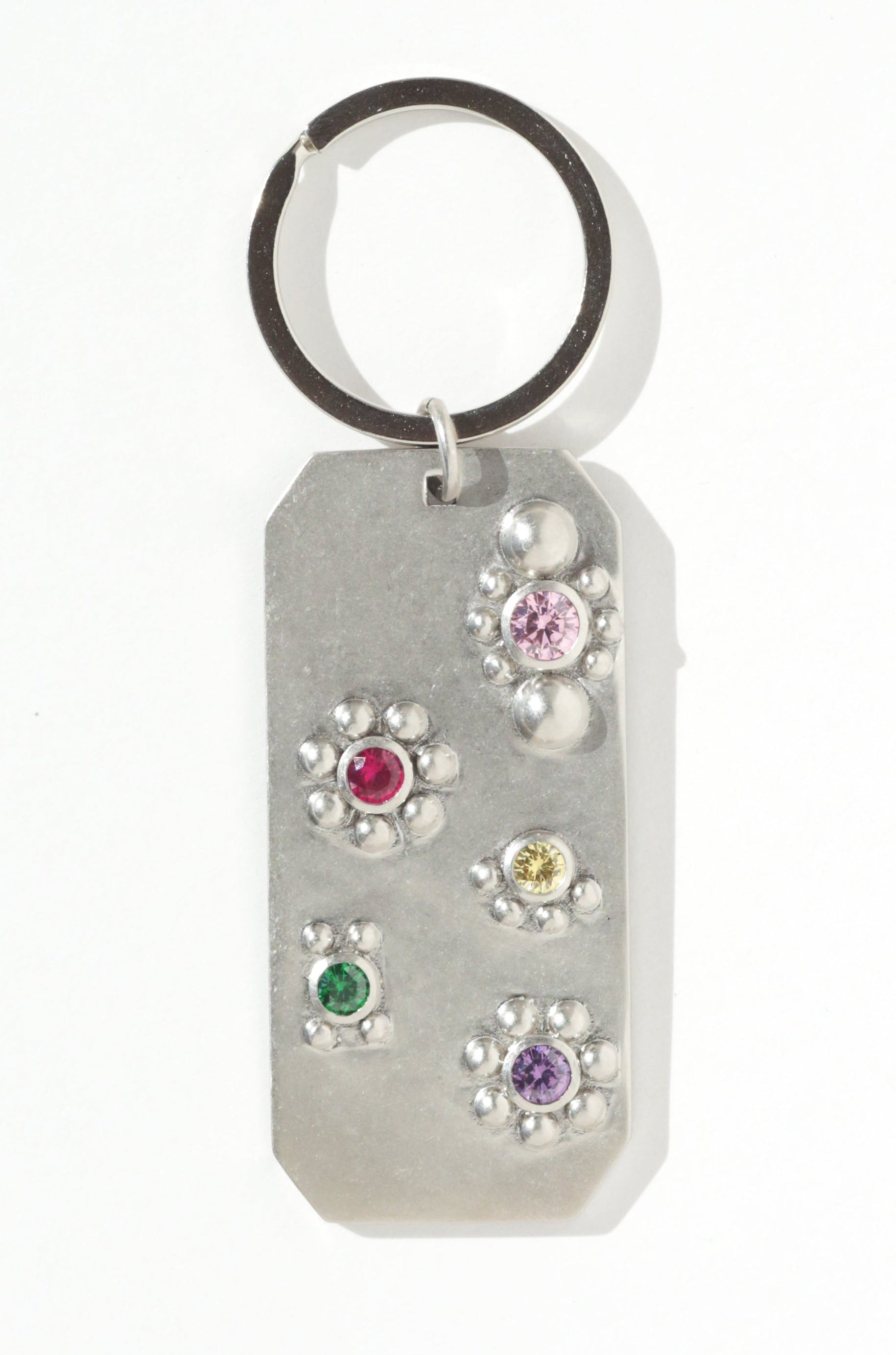 This keychain features five vibrant gemstones linked to a sturdy keychain ring, creating a colorful and eye-catching accessory. Handmade with care, it combines practicality with bold style, making it perfect for everyday use or as a thoughtful gift.