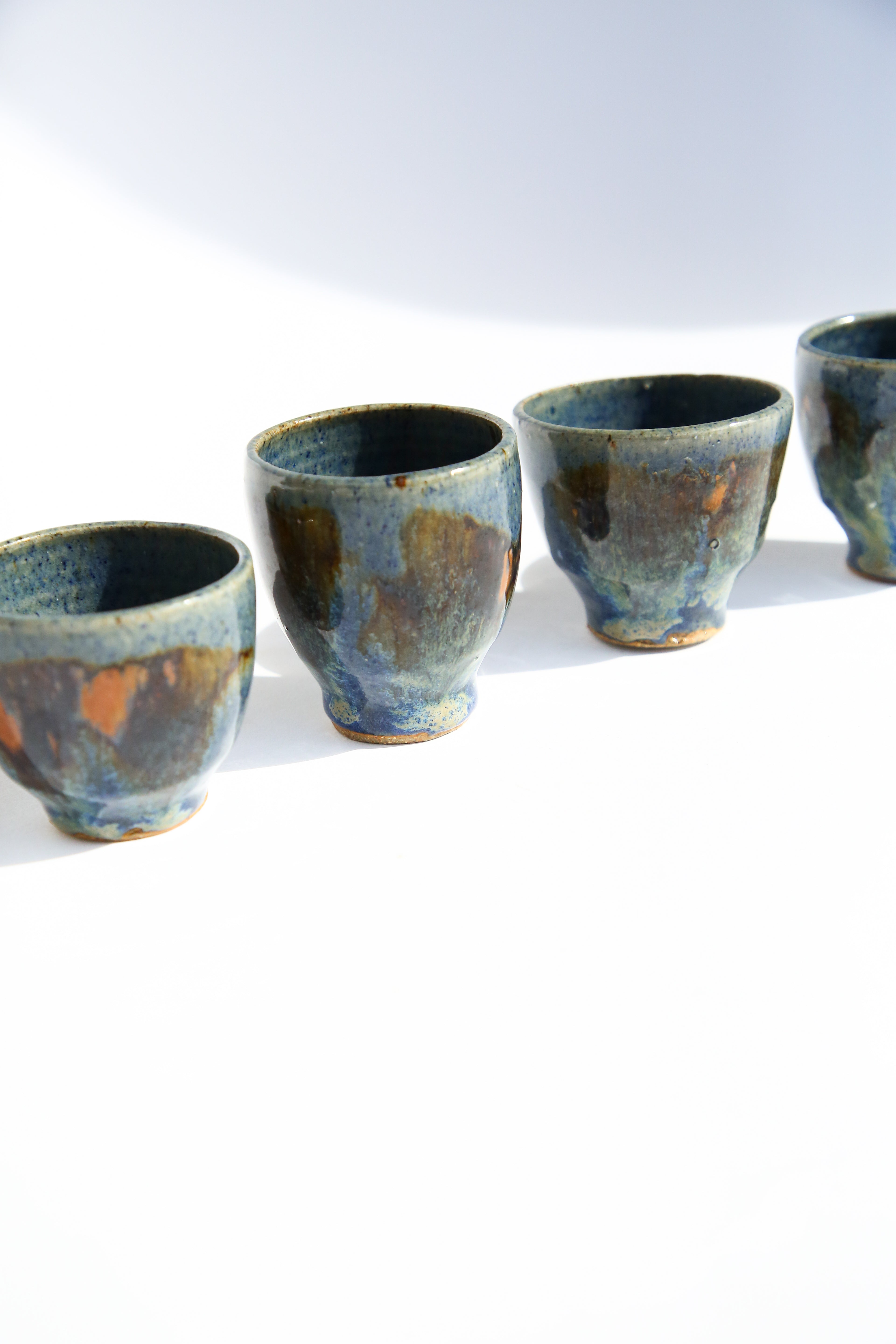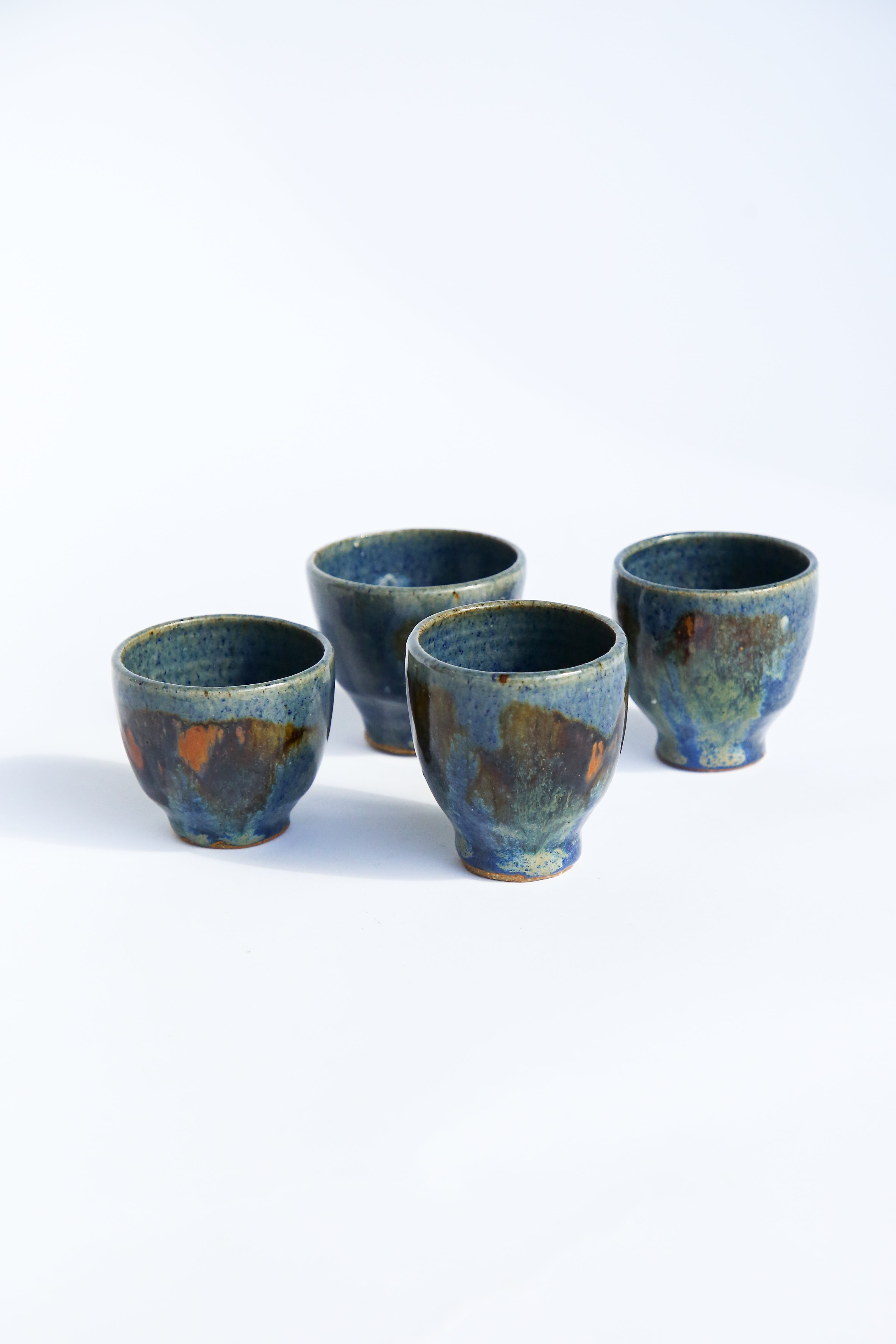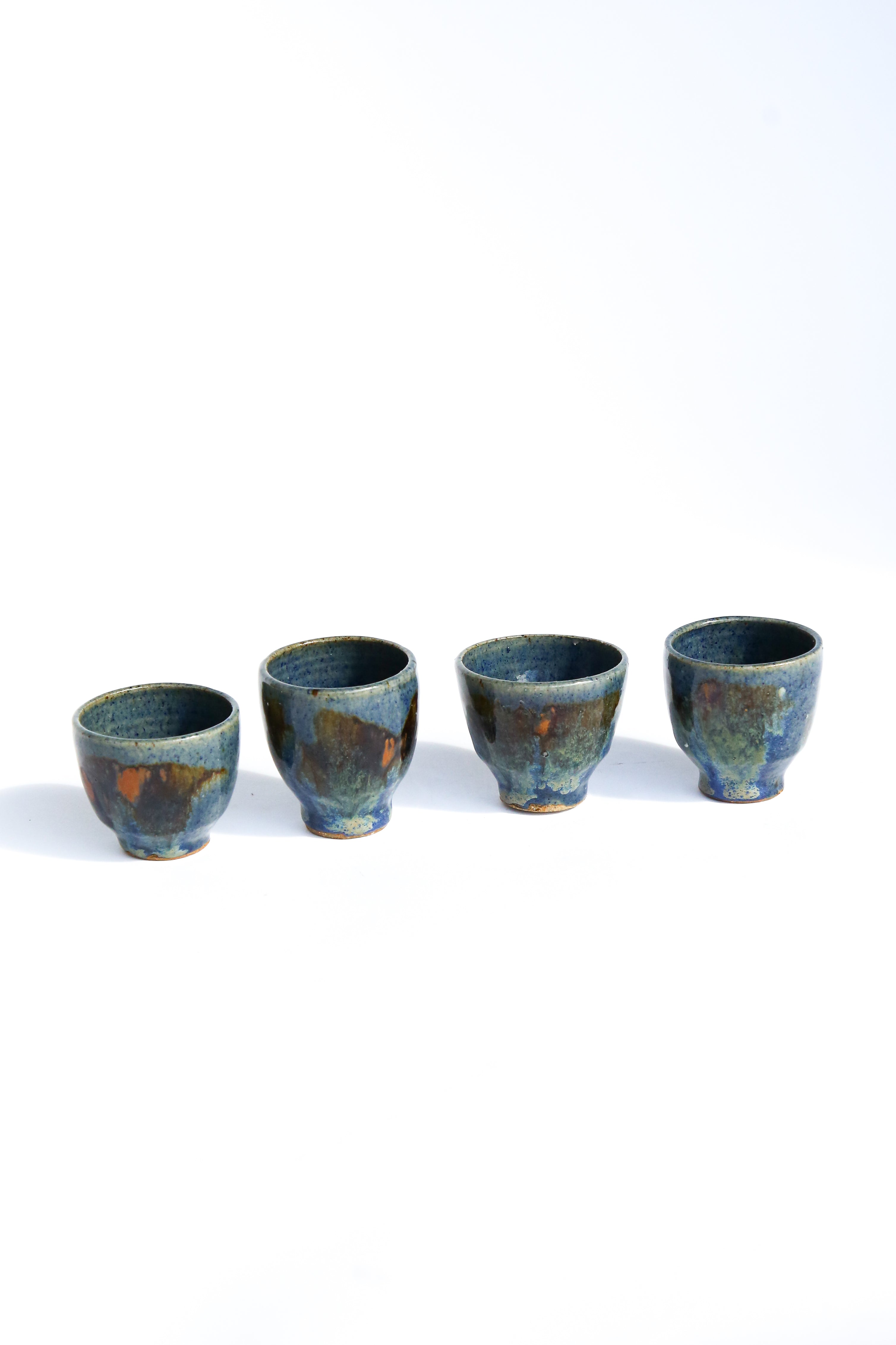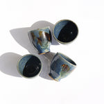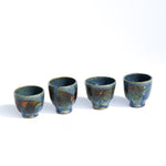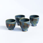 A beautiful set of four handcrafted ceramic cups, perfect for serving sake, tea, or espresso. Each cup is uniquely shaped and glazed. Their organic texture and balanced form make them both functional and visually striking