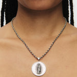 An 18-inch sterling silver box chain necklace featuring a Virgin Mary pendant with delicate floral etching. Thoughtfully crafted to highlight fine detail, this piece carries both elegance and symbolism. Its timeless design makes it perfect for layering or wearing on its own as a meaningful everyday piece.