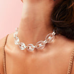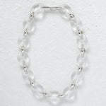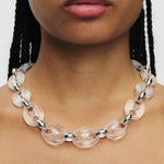 The Soet Necklace features clear resin puffed mariner beads, each linked with sterling silver jump rings and finished with a sleek hook clasp. Designed as a bold yet refined statement piece, it balances modern elegance with sculptural detail.