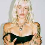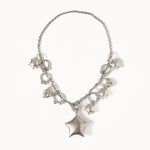The Charm Necklace, hand-designed and created by us, is a versatile statement piece that transforms into multiple styles. This sterling silver design includes four puffed star earrings, two puffed heart earrings, five barbell earrings, and the 18inch puffed star necklace. Wear it as a bold charm necklace or style the pieces individually as earrings, giving you endless ways to accessorize.
